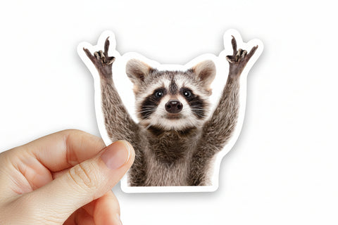 Sticker of a raccoon with raised arms held by a hand against a colorful background